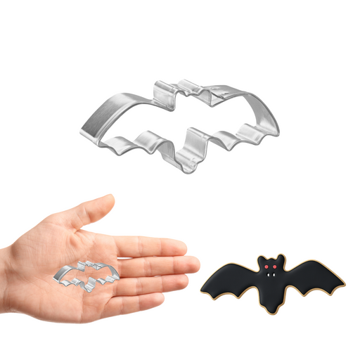 Made in the USAMini Bat cookie cutter, made of sturdy tin, Size 2.25 in. wing span by 1/2 in. up and down. Depth 5/8 in., Color silverTags: Halloween, Fall, Harve...