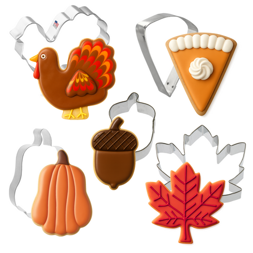 Made in the USAThanksgiving Cookie Cutter 5 Pc Set HS0563. Includes 3.5" Turkey, 3.5" Sugar Maple Leaf, 2.5" Acorn, 3.75" Tall Pumpkin, 3.75" Pie Slice . Hand mad...